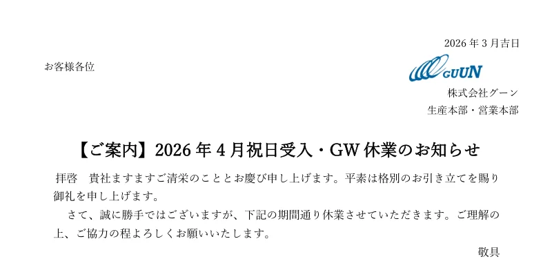 トップ/ニュース一覧/2026年4月祝日受入・GW休業のお知らせ